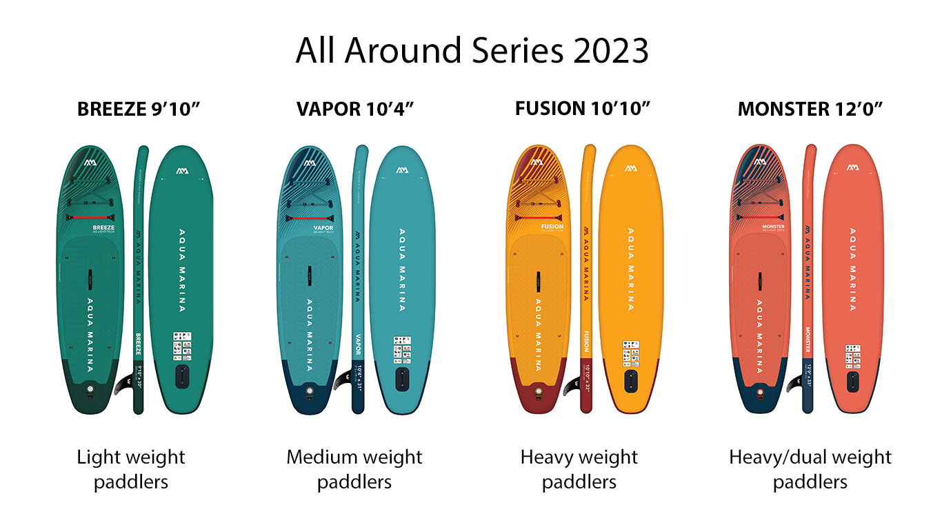 A SUP for all, the ALL-AROUND line is our most affordable SUP line and comes with a newly designed board shape and amazing graphics. Easy to transport, simple to set up, stable and versatile. Upgraded to better-balanced sizes and shapes to suit a wider range of paddlers looking for an easier ride and higher carrying capacity.